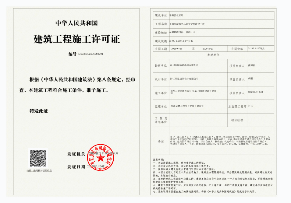 关于平阳县新城第二职业学校新建工程建筑工程施工许可证公告